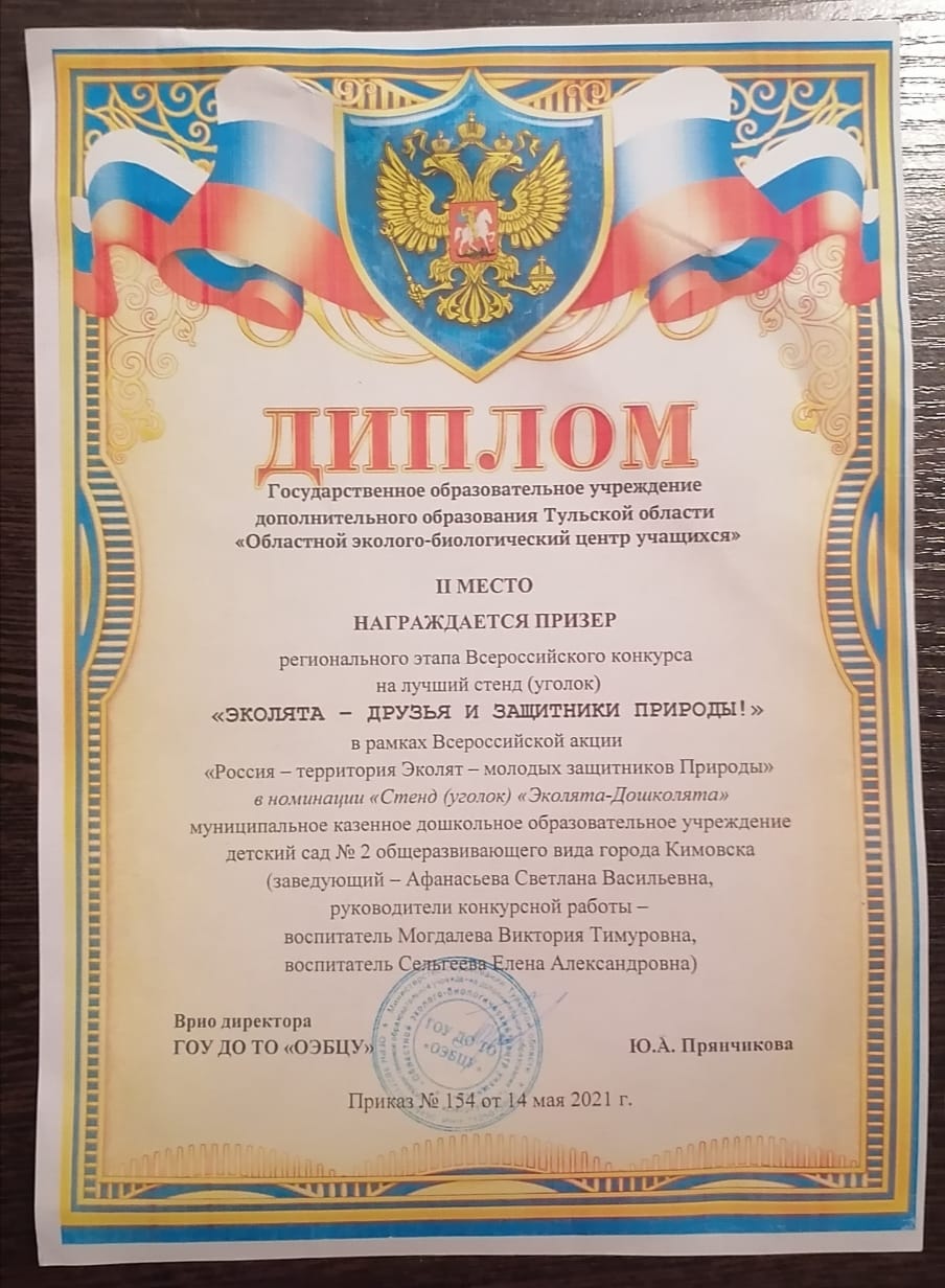Призер (2 место)регионального этапа Всероссийского конкурса на лучший стенд "Эколята - друзья и защитники природы!"