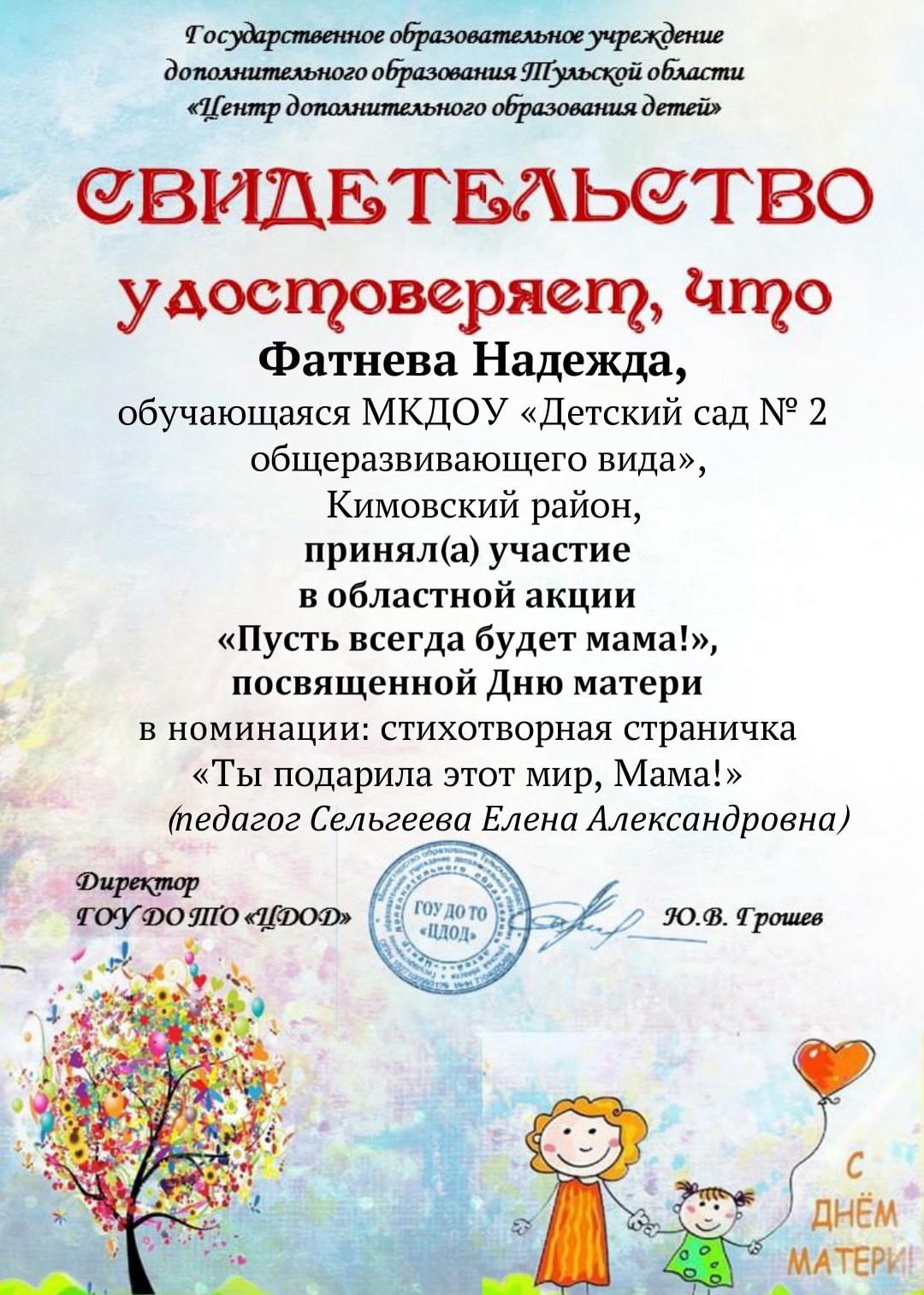 Наши дети принимали участие в областной акции «Пусть всегда будет мама!», посвященной Дню матери. И получили памятные свидетельства, поздравляем!