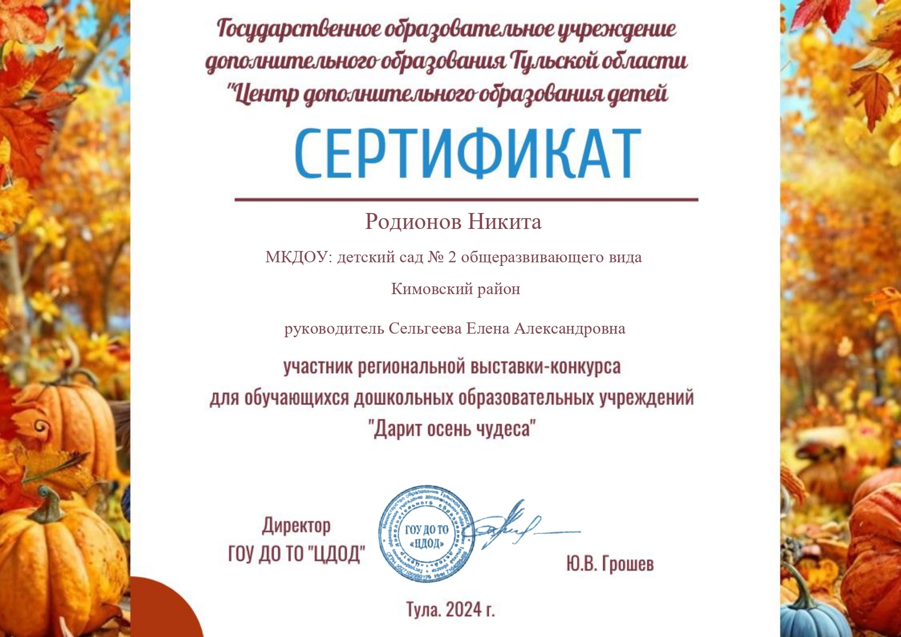 Воспитанник старшой группы Родионов Никита приняли участие в региональной выставке - конкурсе "Дарит осень чудеса". Молодец. Так держать!