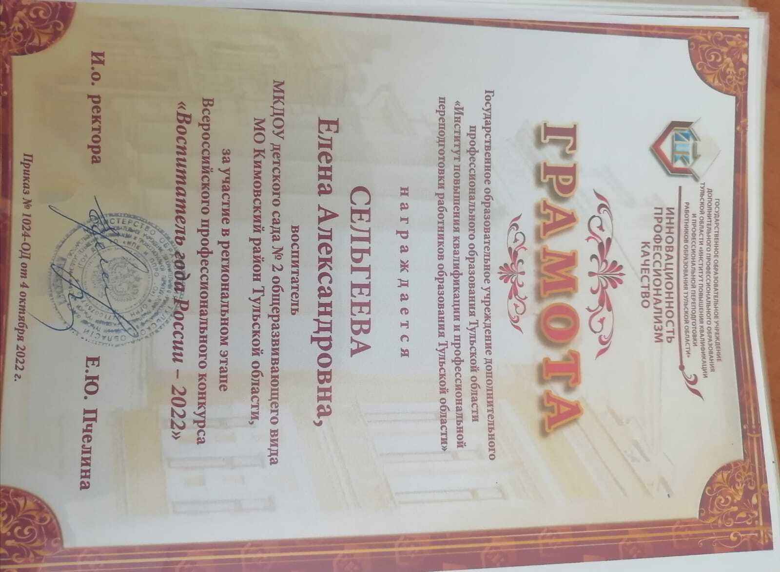 Лауреата регионального этапа Всероссийского профессионального конкурса "Воспитатель года России" Тульской области 2023 год