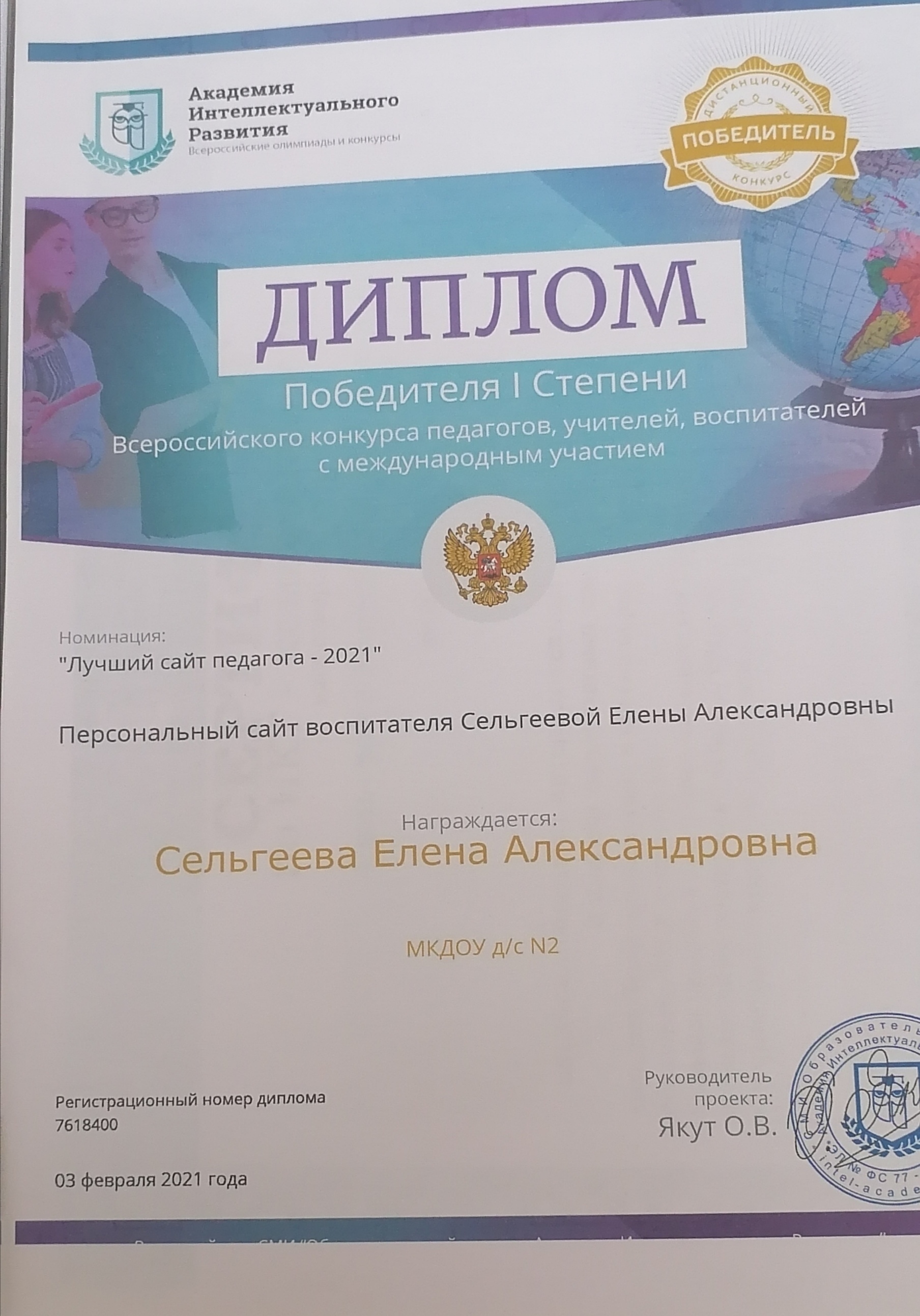 Победитель регионального этапа IX Всероссийского конкурса «Воспитатели России» 2021г.