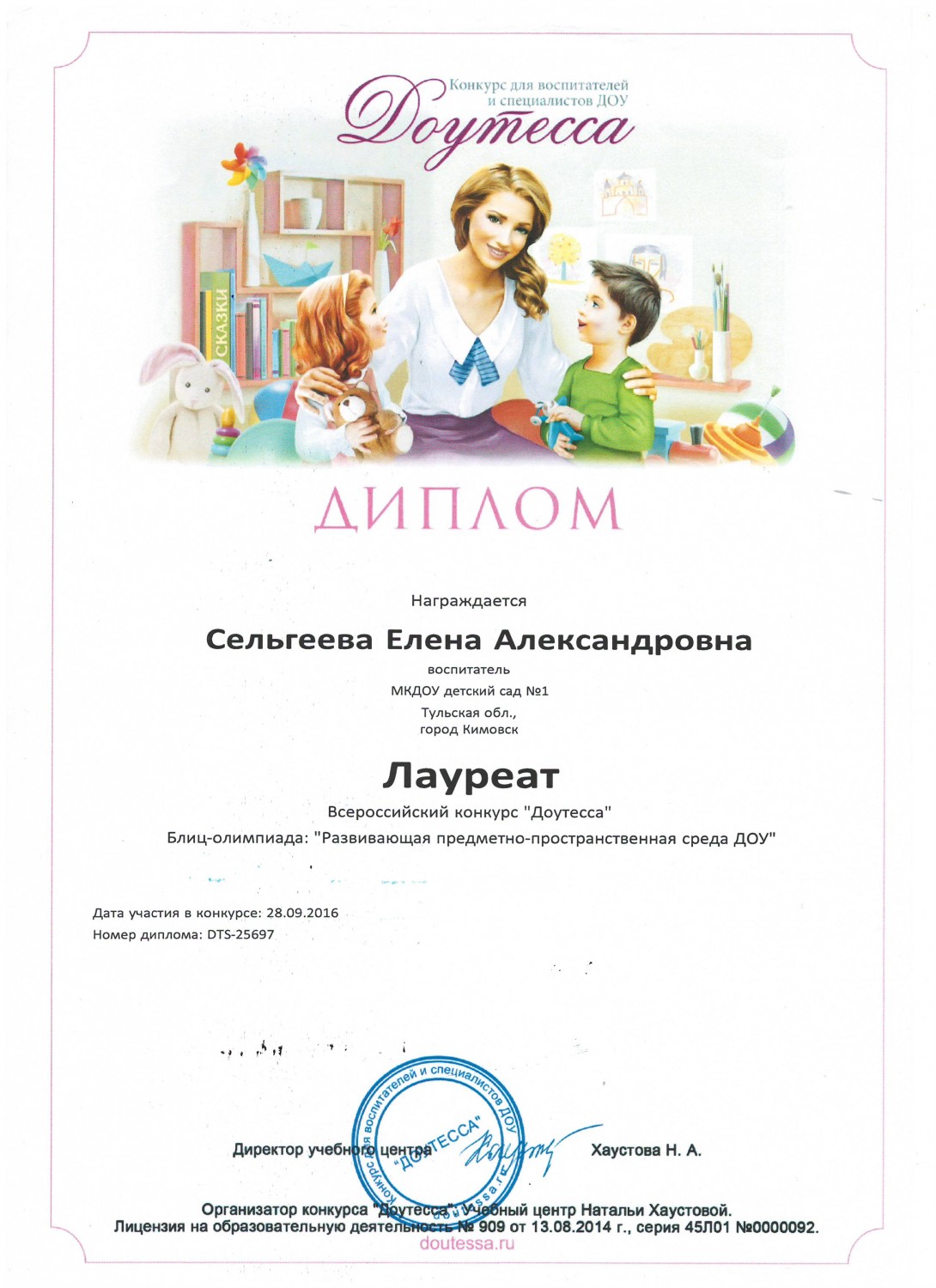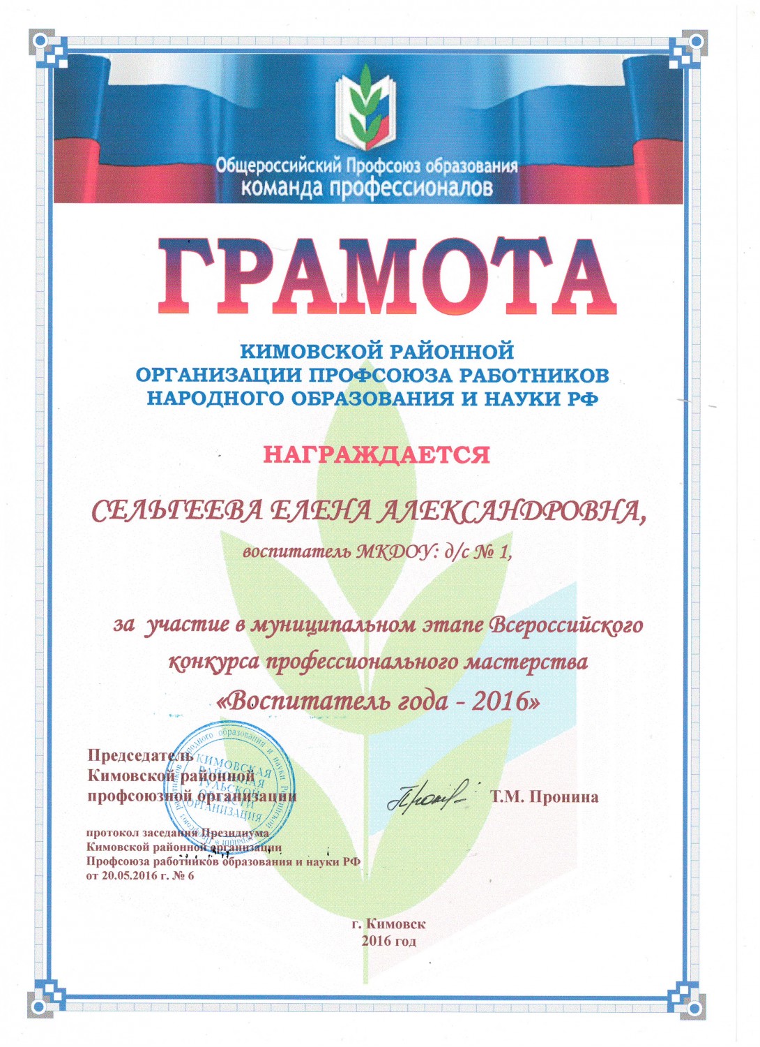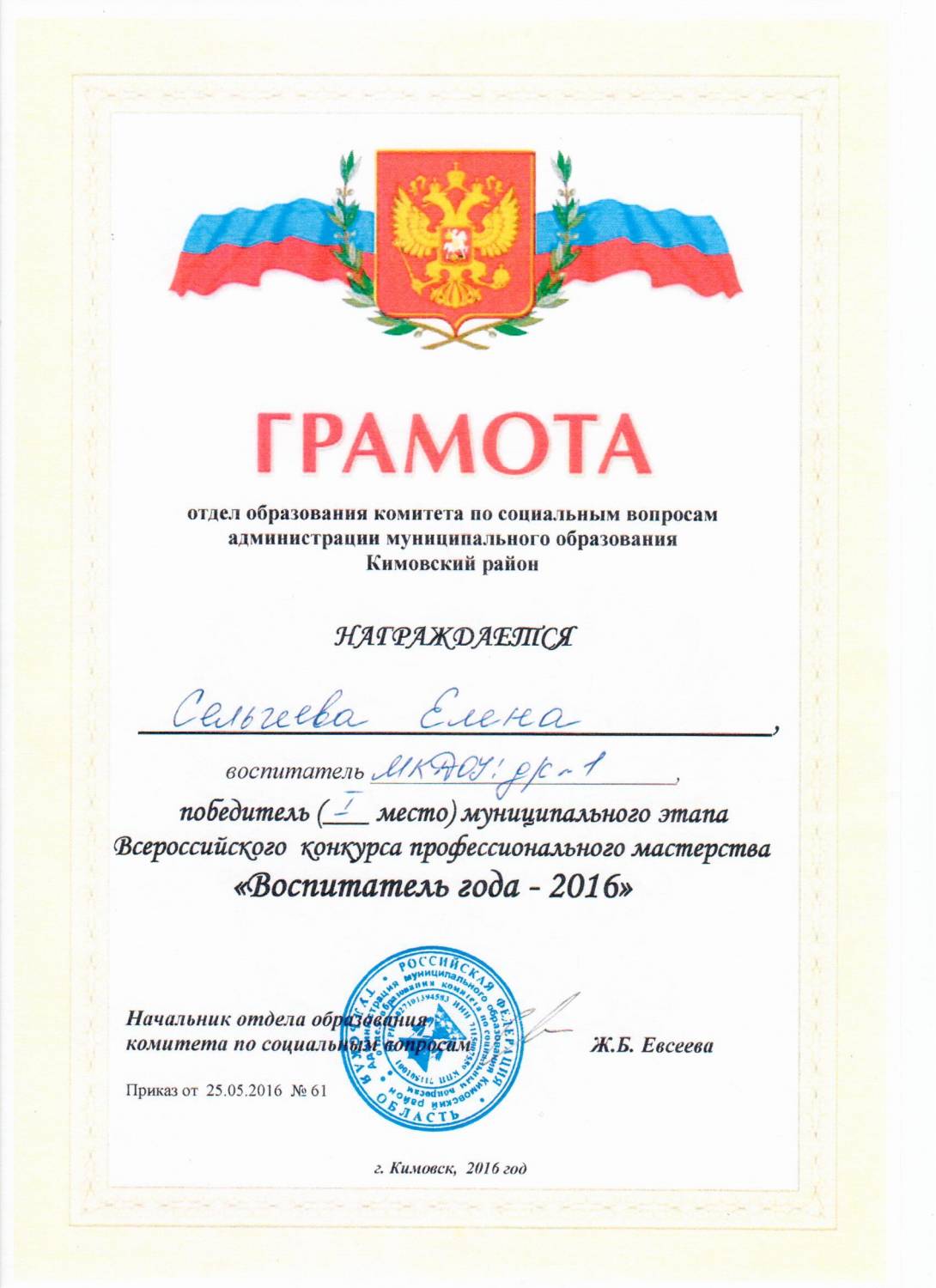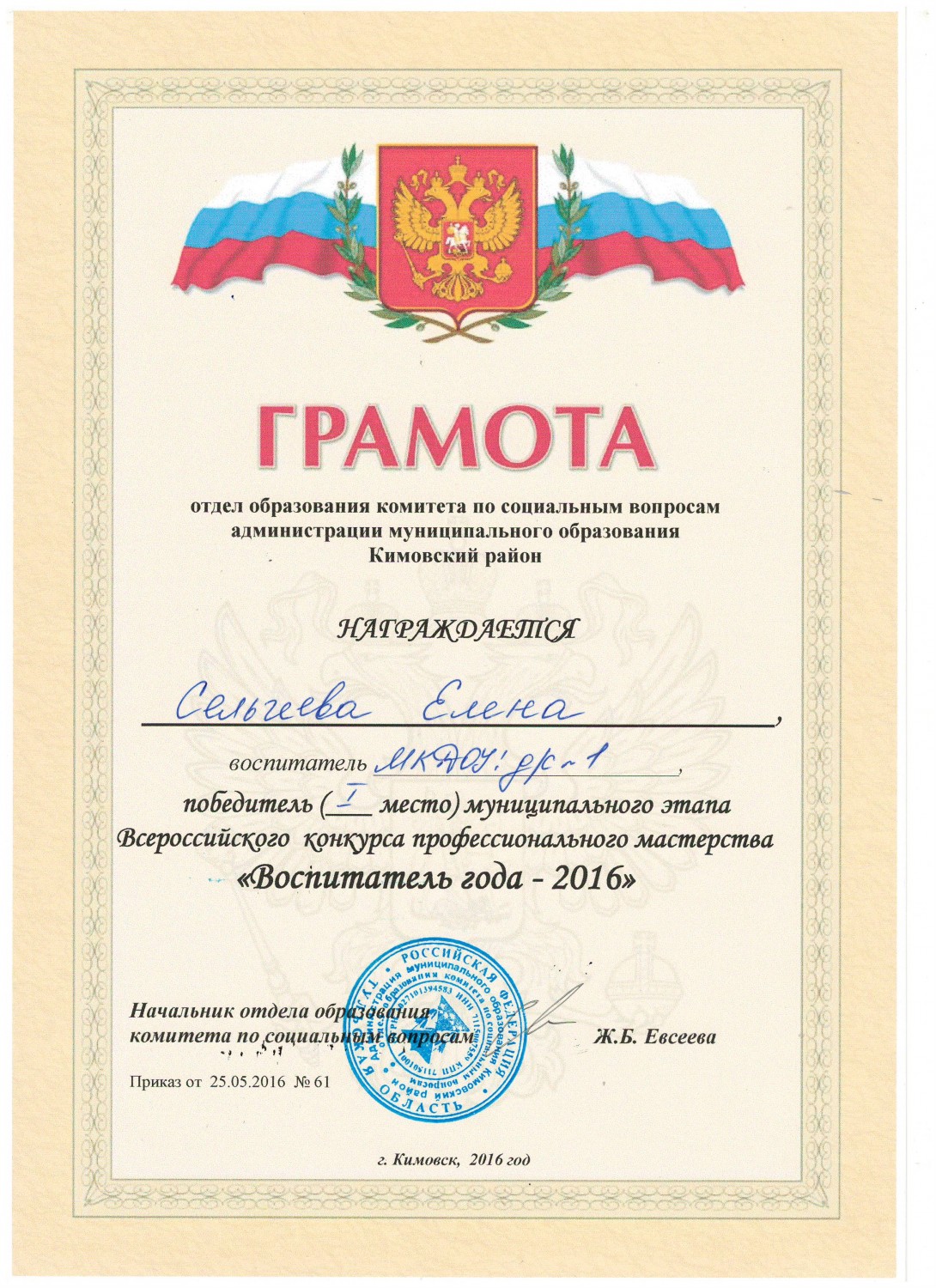 Победитель 1 место муниципального этапа Всероссийского конкурса профессионального мастерства "Воспитатель года - 2016"