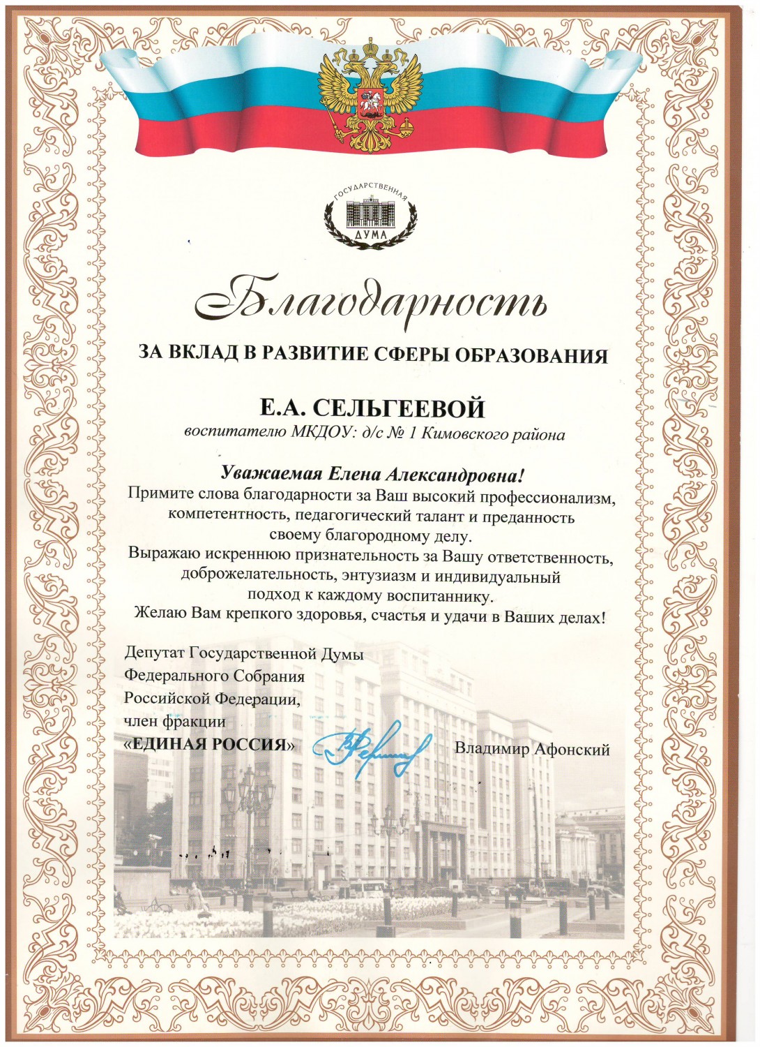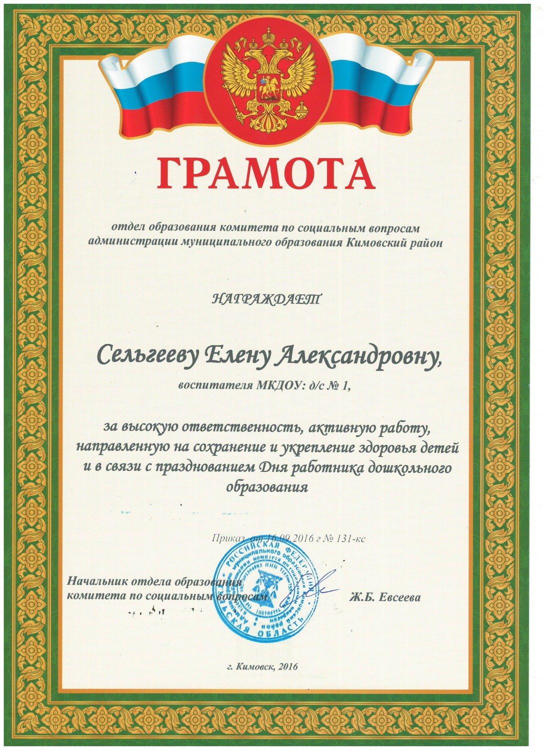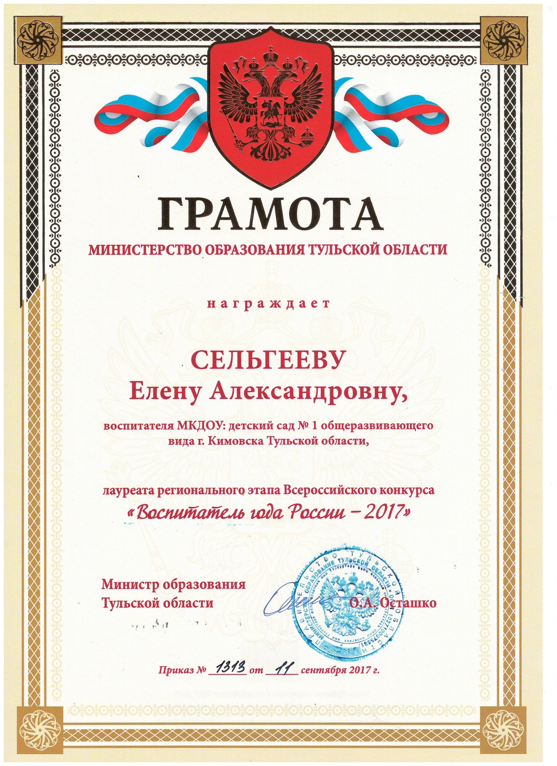 Лауреат регионального этапа Всероссийского конкурса "Воспитатель года России" 2017