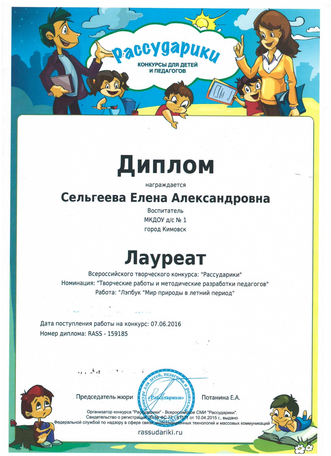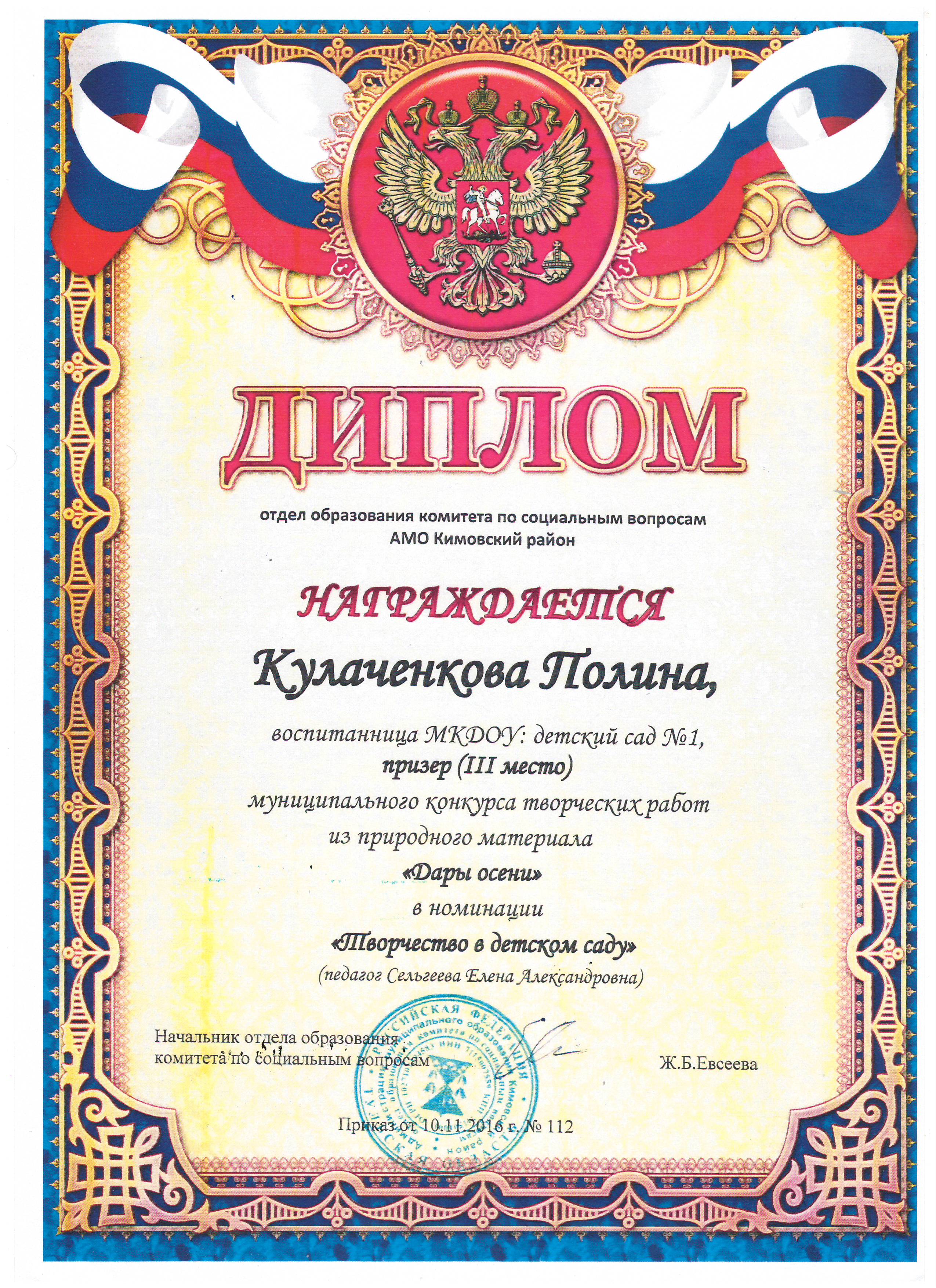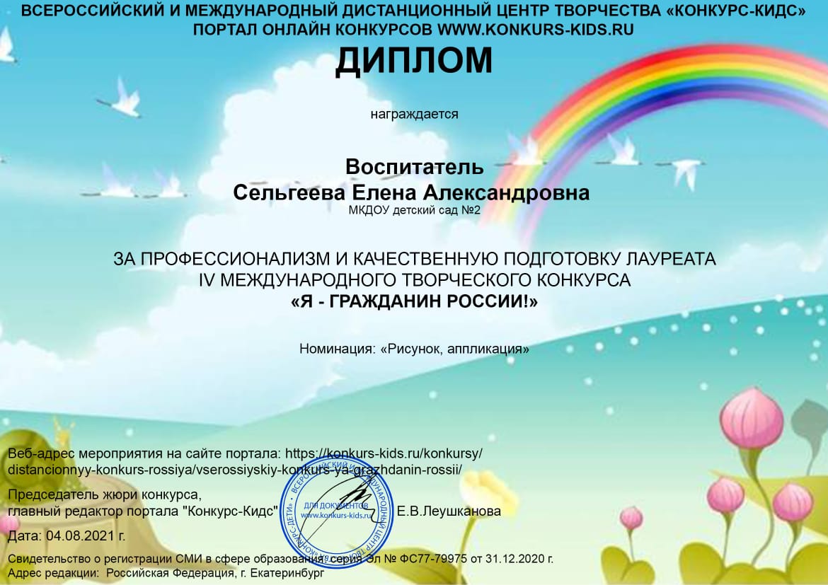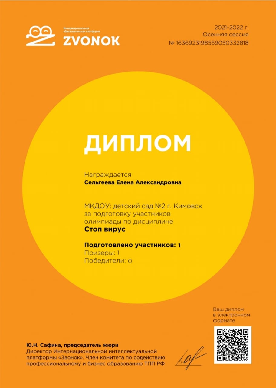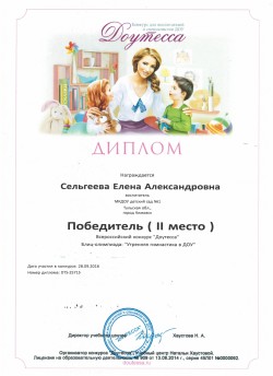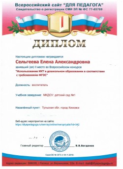 в номинации "Эколята-дошколята" педагоги Сельгеева Елена Александровна и Могдалева Виктория Тимуровна награждены дипломами призера (2 место)
